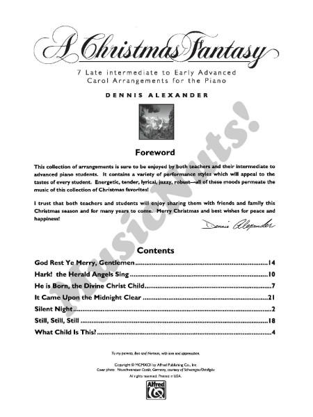 A Christmas Fantasy contains a wide range of favorite Christmas selections for late intermediate to early advanced pianists. Arranged in the “Alexander style, ” this collection features a multitude of attractive selections, from romantic to upbeat, each with solid pedagogical value. Both teachers and students will find this the perfect book to have on the piano for the holiday season. Titles: God Rest Ye Merry, Gentlemen * Hark! The Herald Angels Sing * He Is Born, the Divine Christ Child * It Came Upon the Midnight Clear * Silent Night * Still, Still, Still * What Child Is This?