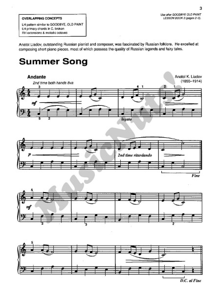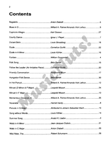 The Repertoire Books contain attractive compositions from the 17th century to the present. The pieces have been organized in progressive order and meet the requirements of many piano festivals, auditions and competitions. The books may also be used as sight reading material or as a supplement to other method books. Titles: Bagatelle (Diabelli) * Blues in D (Palmer/Lethco) * Capriccio Allegro (Gossec) * Courtly Dance (Pleyel) * Distant Bells (Streabbog) * Etude (Gurlitt) * Etude in A Minor (Kohler) * Fanfare (Duncombe) * Folk Song (Bartok) * Follow the Leader (Gurlitt) * Friendly Conversation (Beyer) * Hungarian Folk Dance (Bartok) * In Hot Pursuit (Palmer/Lethco) * Minuet (D Minor & F Major) (L. Mozart) * Minuet in F Major (L. Mozart) * A Momentous Occasion (Palmer/Lethco) * Novelette (Harriet Hardy) * Prelude in G Major (Bach) * Song Without Words (Kohler) * Summer Song (Liadov) * Waltz in A Minor (Dubois) * Waltz in C Major (Diabelli) * The Wild Rider (Schumann).