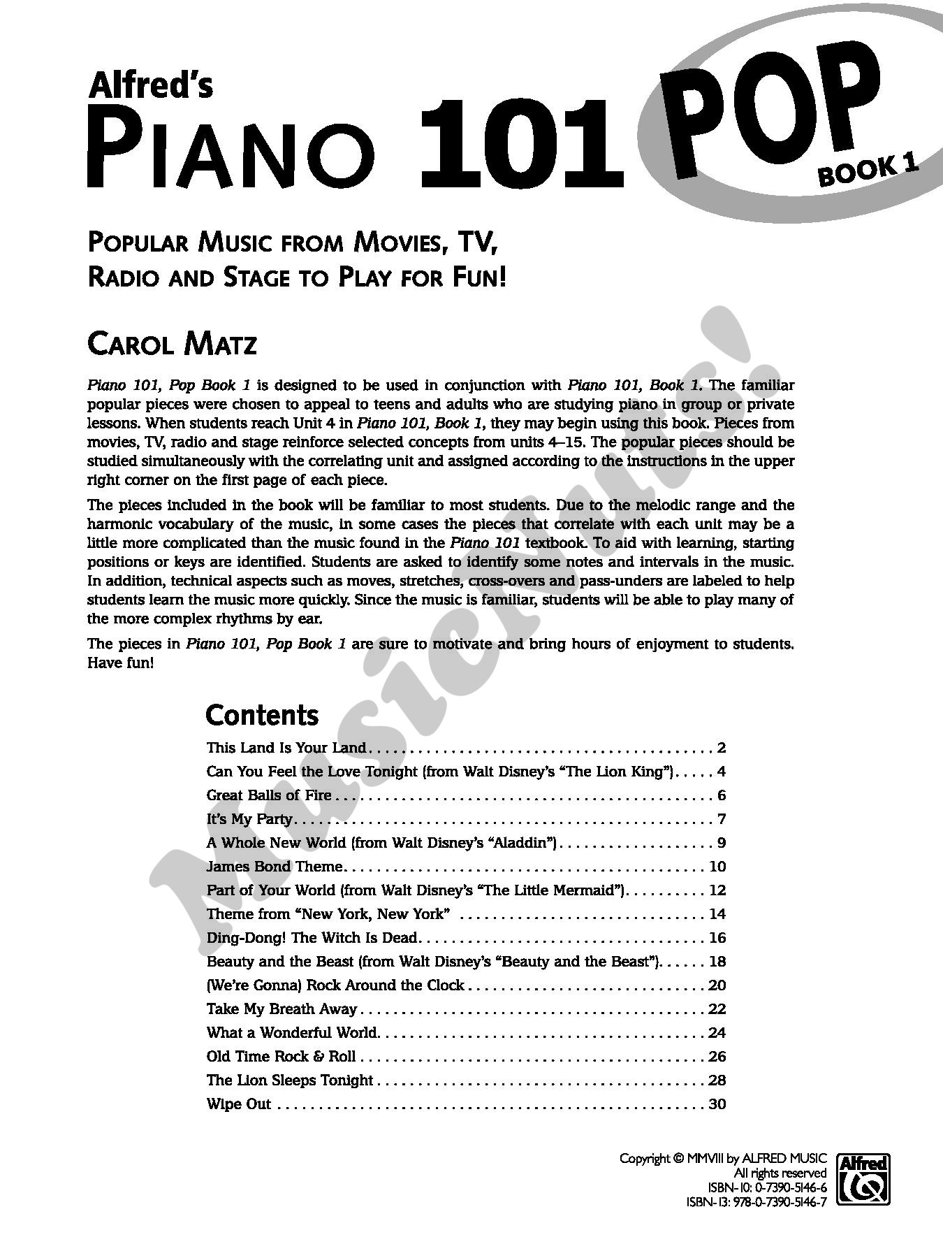 Designed to be used in conjunction with Piano 101, Book 1, this collection of popular pieces will help motivate students in continuing their studies. Selections from movies, TV, radio and stage reinforce concepts from each unit of the book, beginning with Unit 4. Titles: Beauty and the Beast (from Walt Disney’s Beauty and the Beast) * Can You Feel the Love Tonight (from Walt Disney’s The Lion King) * Ding-Dong! The Witch Is Dead (from The Wizard of Oz) * Great Balls of Fire * It’s My Party * The James Bond Theme * The Lion Sleeps Tonight * Old Time Rock & Roll * Part of Your World (from Walt Disney’s The Little Mermaid) * (We’re Gonna) Rock Around the Clock * Take My Breath Away * Theme from New York, New York * This Land Is Your Land * What a Wonderful World * A Whole New World (from Walt Disney’s Aladdin) * Wipe Out.