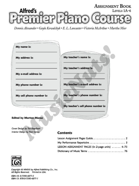 Alfred’s Premier Piano Course Assignment Book Levels 1A-6