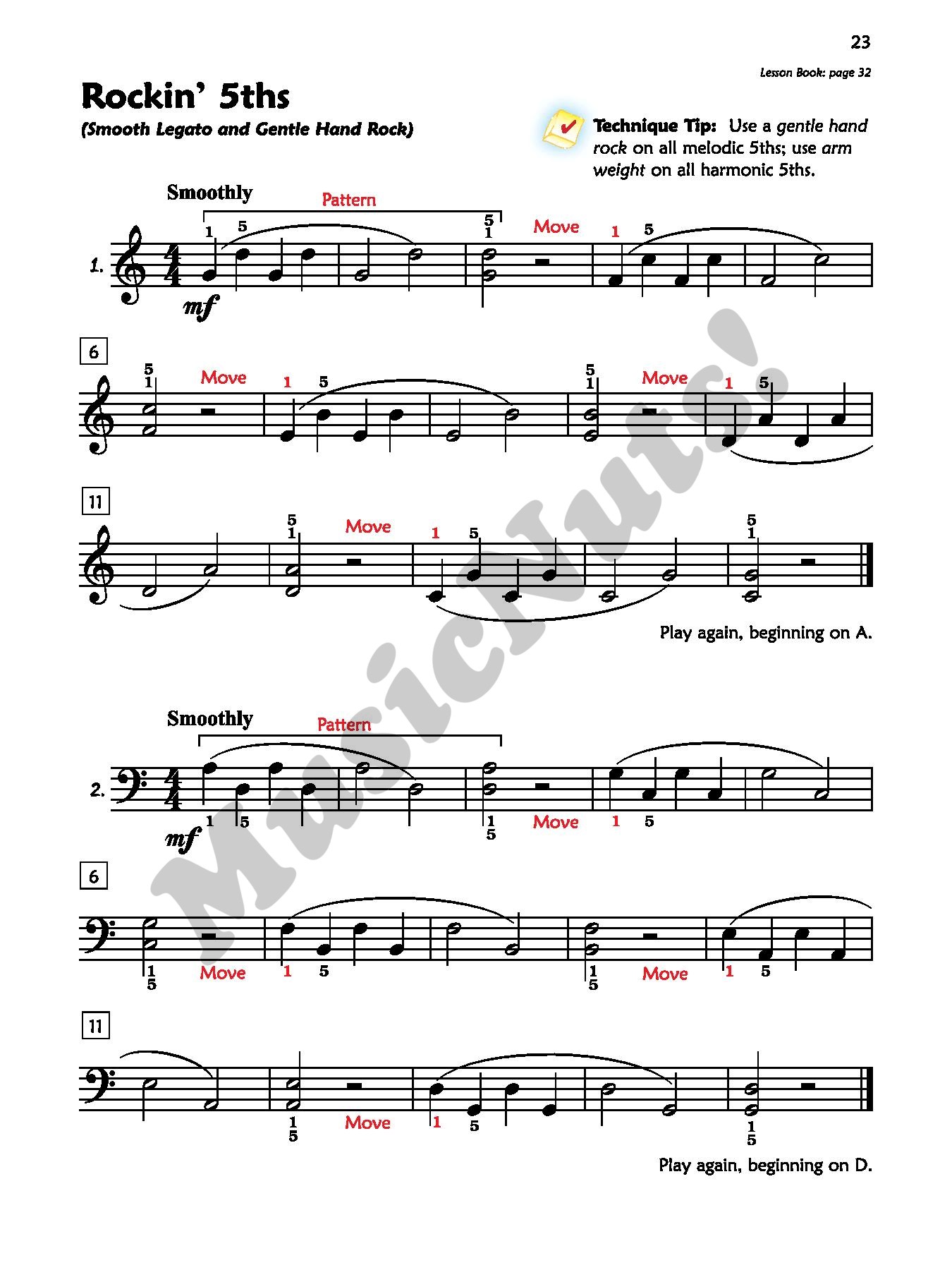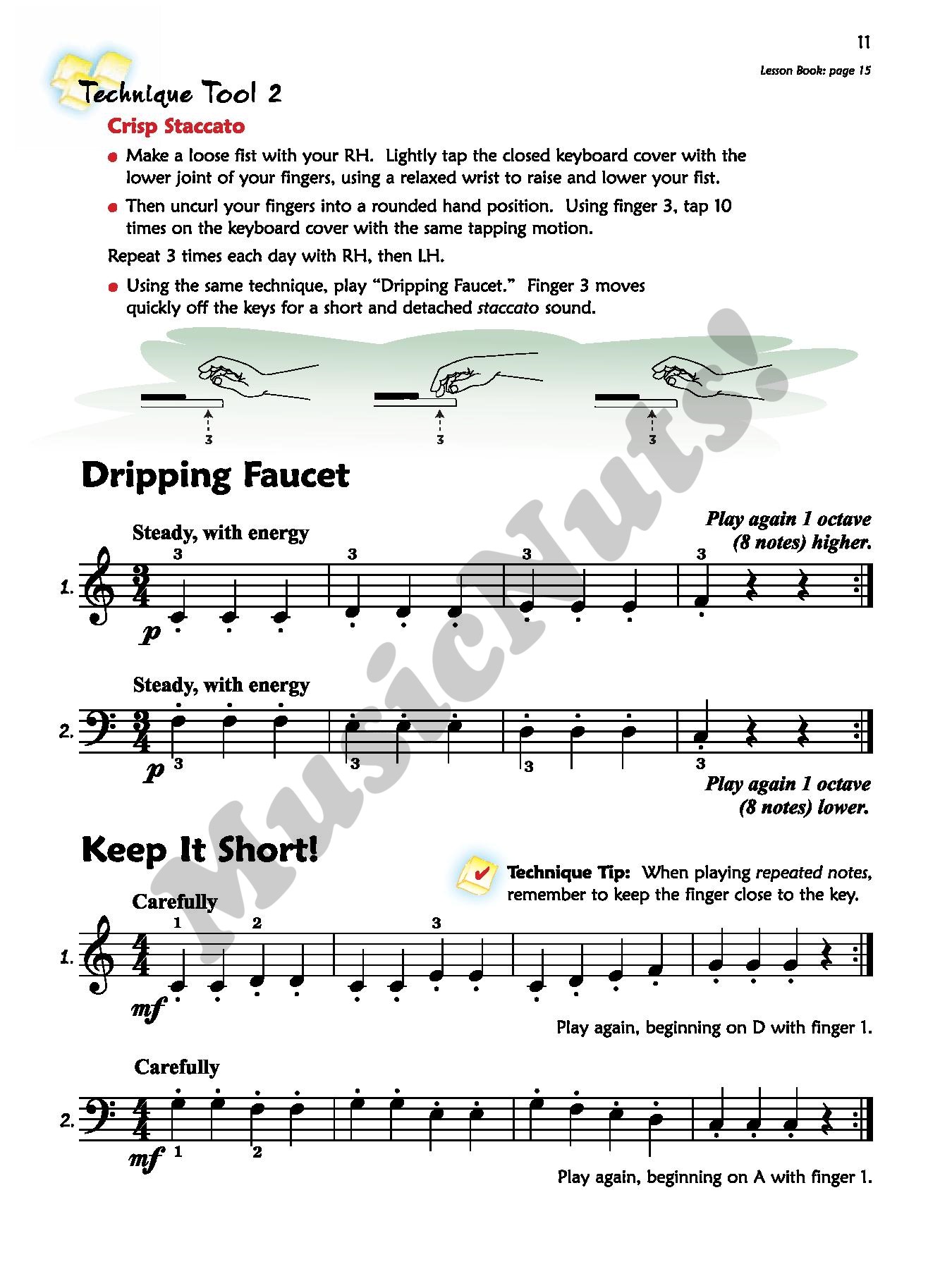 The technical tools and artistic skills learned in Technique 1A are enhanced and expanded in Technique 1B. Four new technique tools are introduced that relate to smooth legato, crisp staccato, rising wrist and amazing phrasing. Patterned exercises provide repetitions that make technique feel natural and artistic etudes showcase a student’s technique in an expressive musical setting. New to this level are Hands-Together Workshops that focus on developing the skills necessary for coordinating hands-together playing. Each page in the Technique Book correlates with a specific page in the Lesson Book.