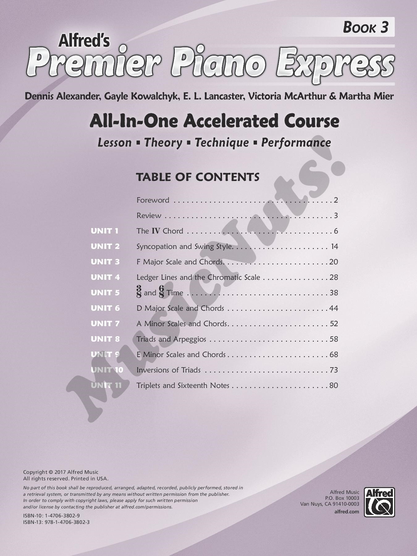 Premier Piano Express is designed for students who need a fast-paced approach to piano study. Based on the concepts and music from Premier Piano Course, this All-In-One Accelerated Course integrates Lesson, Theory, Technique, and Performance pages. Book 3 continues the steady development of artistry and keyboard skills that began in Books 1 and 2. The book is organized into skills-based units that feature clear explanations of important musical concepts. Worksheets within each unit provide review and strengthen understanding. Included with the book is a CD-ROM that contains both audio performances on acoustic piano and orchestrated accompaniments for selected pieces. Accompaniments are also available for download.