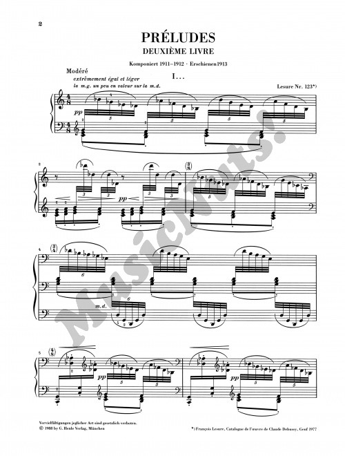 In 1913, three years after publication of the Préludes I, another collection of twelve Préludes appeared. The pieces are longer and make use of a very wide register, which is why Debussy mainly notated them on three staves. As with the first volume of Préludes the programmatic additions only appeared at the end of each piece. The cycle closes with the virtuosic and brilliant Feux d’artifice, fireworks of pianistic bravura in the true sense of the word. The piano writing and title of no. 11, Les tièrces alternées, already hints at the twelve Études of 1915 (HN 390) with which Debussy was to end his piano œuvre.