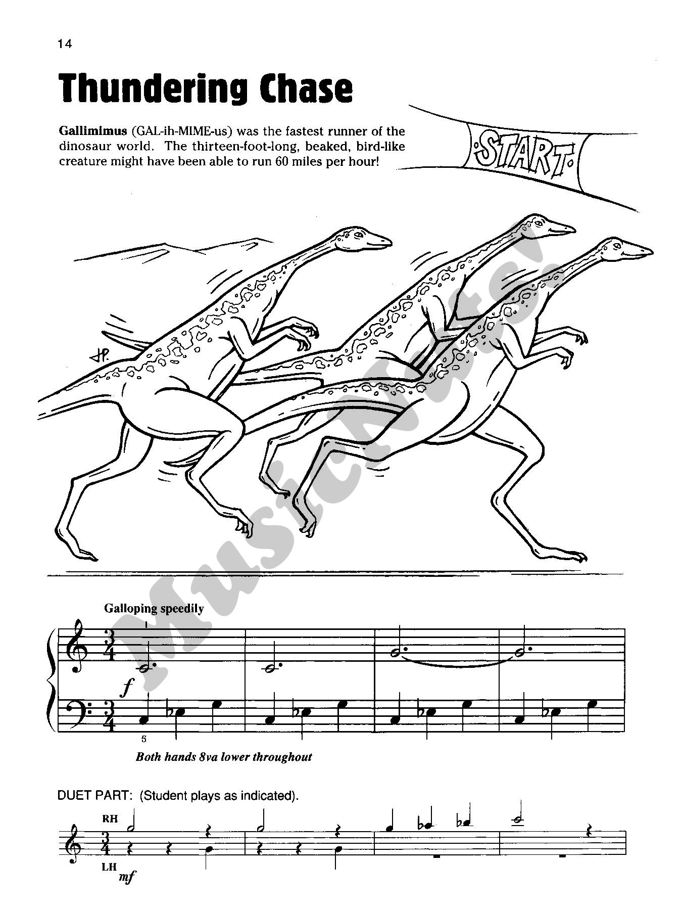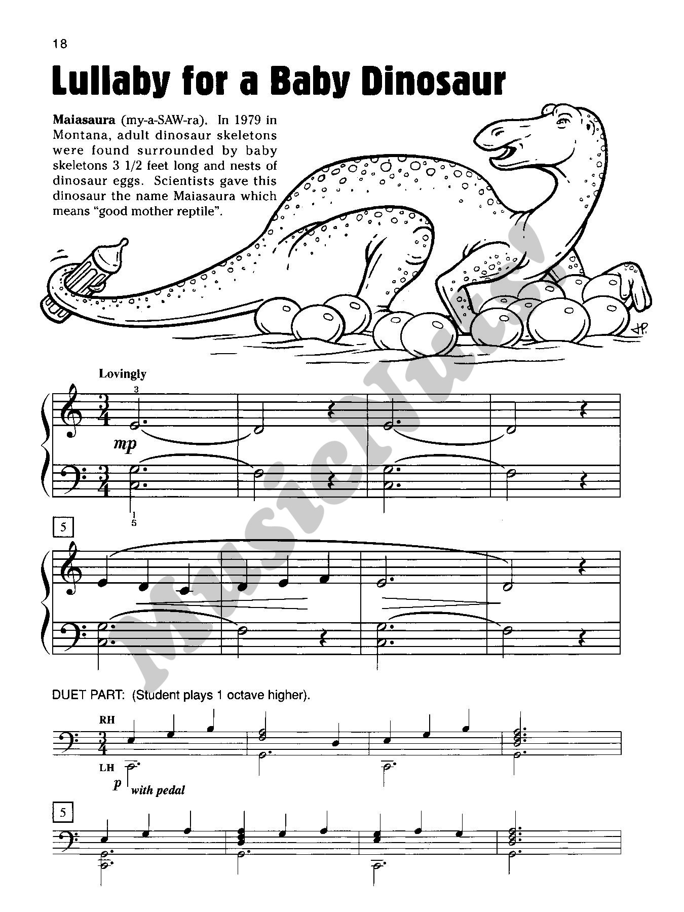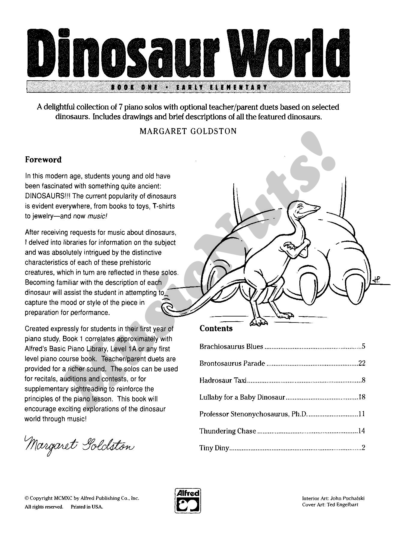 A delightful collection of 7 piano solos with optional teacher/parent duets based on selected dinosaurs. Includes drawings and brief descriptions of all the featured dinosaurs.