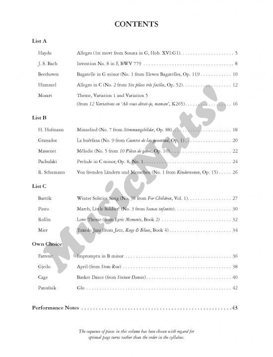 The Edition Peters Grade 5 Piano Anthology comprises 14 pieces from lists A, B and C of the Associated Board syllabus, together with 4 pieces suitable for the own-choice section of the Performance Exam. The anthology supports students preparing for either the Practical Exam or the Performance Exam. Those preparing for the Performance Exams are aided by Performance Notes by Norman Beedie (Lecturer in Classical Improvisation, Piano and Conducting at the Royal Conservatoire of Scotland), which give advice on technique and interpretation for each piece, and guidance on preparing an effective programme. The pieces in this volume are drawn from the extensive range of piano music in the Edition Peters catalogue – one of the widest available. The own-choice pieces provide a valuable selection of fascinating repertoire suitable for the Performance Exam. Contents: Invention No. 8 in F, BWV 779 (J. S. Bach); Bagatelle in G minor, Op. 119 No. 1 (Beethoven); Allegro (1st movt from Sonata in G, Hob. XVI:G1) (Haydn); Allegro in C (No. 2 from Six pièces très faciles, Op. 52) (Hummel); Theme, Var. 1 and 5 (from 12 Variations on “Ah vous dirai-je, maman”, K. 265) (Mozart); Minnelied (No. 7 from Stimmungsbilder, Op. 88) (Hofmann); La huérfana (No. 9 from Cuentos de las juventud, Op. 1) (Granados); Mélodie (No. 5 from 10 Pièces de genre, Op.10) (Massenet); Prelude in C minor, Op. 8 No. 1 (Pachulski); Von fremden Ländern und Menschen (No. 1 from Kinderscenen, Op. 15) (Schumann); Winter Solstice Song (No. 38 from For Children, Vol. 1) (Bartók); March, Little Soldier! (No. 3 from Scenas infantis) (Pinto); Love Theme (from Lyric Moments, Book 2) (Catherine Rollin); Tuxedo Jazz (from Jazz, Rags & Blues, Book 4) (Martha Mier); Impromptu (Louise Farrenc); Glo (Roxanna Panufnik); April (from Stone Rose) (Ola Gjeilo); Basket Dance (from Sixteen Dances) (John Cage).