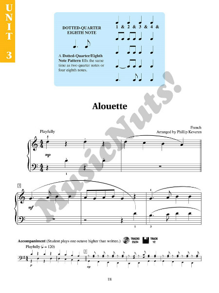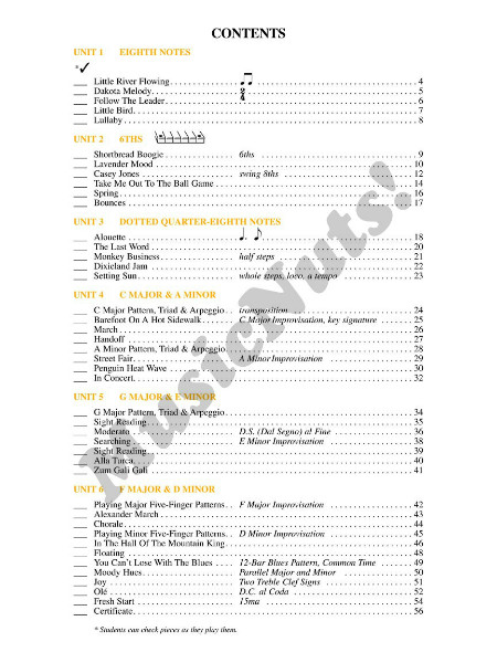Unit 1 of Book 3 begins by introducing eighth notes in 4/4 and 2/4 time. Swing eighths are also presented in the first half of the book. Folk, jazz, classical, and contemporary selections provide students with an interesting variety of repertoire. The second half of Book 3, teaches relative and parallel major/minor five-finger patterns, and students learn to improvise their own songs using these basic patterns. This book also includes access to audio and MIDI files online. The files include playback options to assist students in practice.
