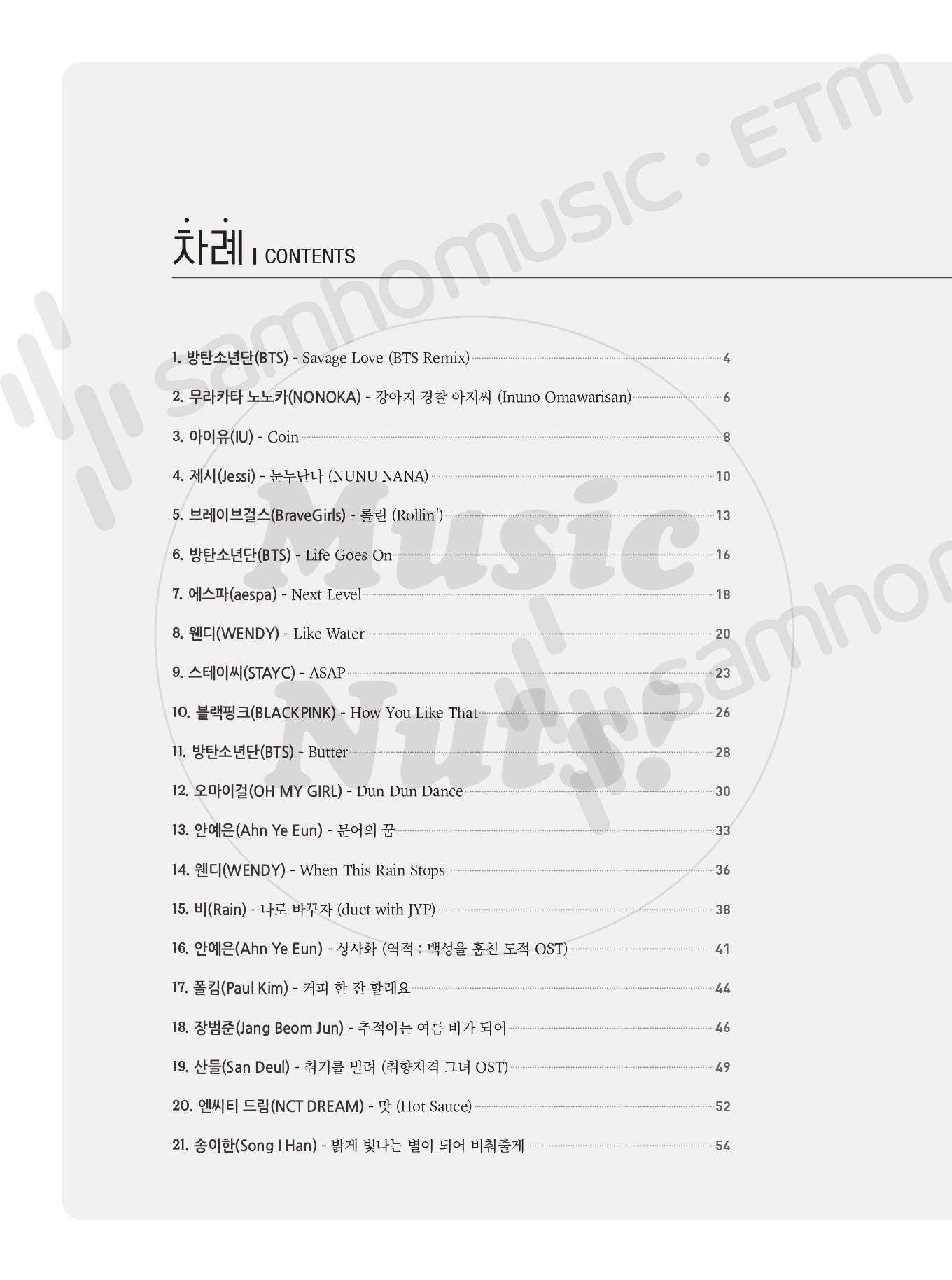 Twice, Aespa, IU, and BTS are the latest K-Pop leaders. The series ‘Easy to Play K-Pop for Piano’ by Teacher Joy has been steadily updated since 2017. There are also the inclusion of popular songs drum rhythm QR codes, making the performances more lively. Additionally, four-hand duet songs are included too, for you to play with your friends or family. In the beginner version, rhythm scores are included for each song to help the left hand accompaniment. Contents: BTS – Savage Love (BTS Remix) ✤ BTS – Savage Love (NONOKA) – Inuno Omawarisan – Savage Love (I U) – Coin ✤ Picture(Jessi) – Daughter (NUNU NANA) ✤ Girls (BraveGirls) – Girls (Rollin’) ✤ Girls (BTS) – Life Goes On ✤ Girls (aespa) – Next Level ✤ Girls (WENDY) – Like Water ✤ STAYC – ASAP ✤ Thank you( BLACKPINK – How You Like That ✤ Honey(Ahn Ye Eun) – Sweetheart ✤ Honey(BTS) – Butter ✤ Honey(OH MY GIRL) – Dun Dun Dance ✤ Singer(WENDY) – When This Rain Stops ✤ Rain – Rain (duet with JYP) ✤ Rain (Ahn Ye Eun) – Performance (Lyrics : Rain Rain OST) ✤ Rain (Paul Kim) – Jang Beom Jun (Jang Beom Jun) – Living Songs (San Deul OST) ✤ New Songs (NCT DREAM) – Hot Sauce ✤ Song I Han – Hot Sauce Sweetheart ✤ Sweetheart(Heize) – Sweetheart ✤ Sweetheart(IU) – Blueming ✤ Sweetheart(Kang Seung Yoon) – Sweetheart ✤ Sweetheart(TWICE). ) – Alcohol-Free ✤ Love(Yang YoSeob), Love(Jeong Eun Ji) – LOVE DAY (2021) (Virginal OST) ✤ Ugly(IU) – Celebrity ✤ Guy(Juk Jae) Love OST) ✤ Love (Jang Beom Jun) – Love OST ✤ Love (JOY) – Honey (HELLO) ✤ Honey(Jessi) – Honey X (What Type of X) ✤ Honey(IU) – Honey Honey ✤ Honey(Juk Jae) – Honey Honey ✤ Lisa (LiSA) – Lisa (Homura ) (Laughing OST) ✤ Boy(Roel) – Girlfriend (Kamado Tanjiro no Uta) (Laughing OST) ✤ Girl(LiSA) – Girlfriend (Gurenge) ( The Lion King OST) ✤ Lion(IU ) – Lemon ✤ Lemon (Yonezu Kenshi) – Lemon (Online OST). Duet hits include: Lion(10CM) – Lion ✤ Lion(Jang Yoon Jung) – Lion.