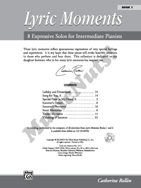 This collection of intermediate piano solos is perfect for the romantic at heart. All of the pieces are lyrical, expressive, and absolutely beautiful! Titles: Lullaby and Dreamland * A Song for You * A Special Place in My Heart * Summer’s Dream * Summer’s Nocturne * Sweet Memories * Tender Moments * Thinking of Summer.