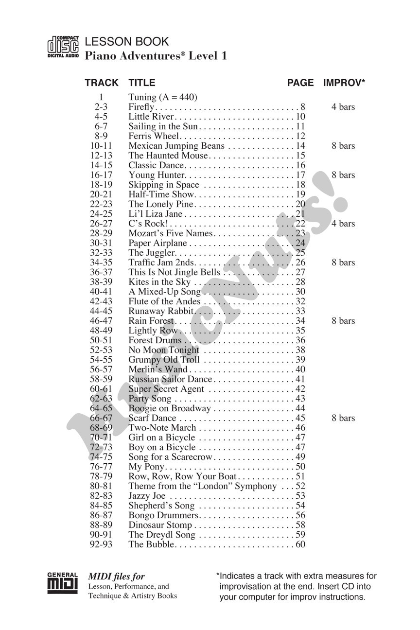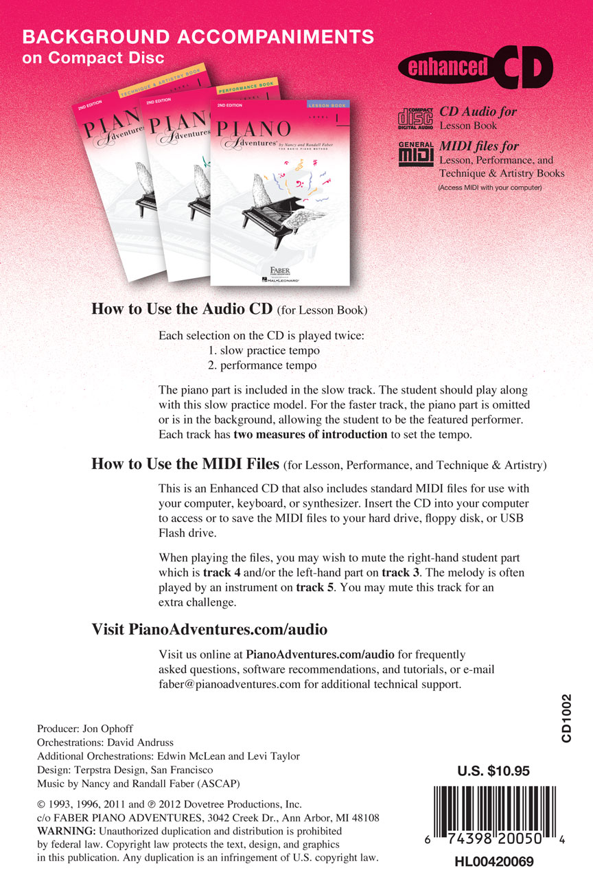 This compact disc contains orchestrated background accompaniments for the pieces in the 2nd Edition Level 1 Lesson Book. Teachers and students will be delighted by newly orchestrated background accompaniments, improvisation opportunities, and the variety of musical textures. Each selection in the book is played twice: first at a slow practice tempo and then at performance tempo. The piano part is included in the slow track. For the performance track, the piano part is omitted or is in the background, allowing the student to be the featured performer. Songs include: Firefly • Mexican Jumping Beans • Mozart’s Five Names • Traffic Jam 2nds • Kites in the Sky • Forest Drums • Super Secret Agent • Boogie on Broadway • Song for a Scarecrow • Theme from the London Symphony • Dinosaur Stomp and more. The Enhanced CD also includes standard MIDI files that can be accessed with a computer. When used with your software, keyboard, or synthesizer, the MIDI files allow you to adjust tempos, isolate track playbacks, and transpose to different keys. Special bonus: MIDI files for the Piano Adventures® Level 1 Performance Book and the Level 1 Technique & Artistry Book are also included on this CD.