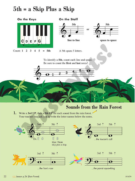 The 2nd Edition Theory Book provides instruction, reinforcement, and creative applications of basic theory concepts. Students will enjoy note-naming with StoryRhymes, explore improvisation, and engage with eye-training and ear-training activities – all within a fun-filled context tied thematically to the Level 1 Lesson Book pieces.