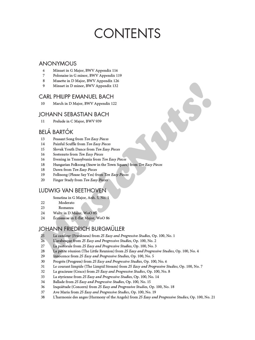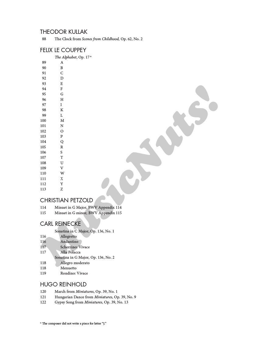 144 pieces by C. P. E. Bach, J. S. Bach, Bartók, Beethoven, Burgmüller, Clementi, Dubernoy, Ellmenreich, Greig, Gurlitt, Handel, Heller, Köhler, Kullak, le Couppey, Petzold, Reinecke, Reinhold, Schumann, Streabbog, and Tchaikovsky. All are at the early intermediate level in a convenient value-priced edition. Includes – ANONYMOUS: Minuet in G Major, BWV Appendix 116; Polonaise in G minor, BWV Appendix 119; Musette in D Major, BWV Appendix 126; Minuet in D minor, BWV Appendix 132 • C. P. E. BACH: March in D Major, BWV Appendix 122 • J. S. BACH: Prelude in C Major, BWV 939 • BARTÓK: 9 selections from Ten Easy Pieces • BEETHOVEN: Sonatina in G Major, Anh. 5, No. 1; Waltz in D Major, WoO 85; Éccossaise in E-flat Major, WoO 86 • BURGMÜLLER: 13 selections from 25 Easy and Progressive Studies, Op. 100 • CLEMENTI: Sonatina in C Major, Op. 36, No.1 • DUVERNOY: Study in A Major from 25 Elementary Studies, Op. 176, No. 15 • ELLMENREICH: Spinning Song, Op. 14, No. 4 • GRIEG: Watchman’s Song from Lyric Pieces, Op. 12, No. 3; National Song from Lyric Pieces, Op. 12, No. 8; Sailor’s Song from Lyric Pieces, Op. 68, No. 1 • GURLITT: 10 selections from Albumleaves for the Young, Op. 101 • HANDEL: Sarabanda from Suite in D minor, HWV 437 • HELLER: Scampering from 25 Studies, Op. 47, No. 1; Lullaby from 25 Studies, Op. 47, No. 19 • KÖHLER: 12 Easy Studies for the Piano, Op. 157 • KULLAK: The Clock from Scenes from Childhood, Op. 62, No. 2 • LE COUPPEY: The Alphabet, Op. 17 • PETZOLD: Minuet in G Major, BWV Appendix 114; Minuet in G minor, BWV Appendix 115 • REINECKE: Sonatina in C Major, Op.136, No. 1; Sonatina in G Major, Op. 136, No. 2 • REINHOLD: March from Miniatures, Op. 39, No. 1; Hungarian Dance from Miniatures, Op. 39, No. 9; Gypsy Song from Miniatures, Op. 39, No. 13 • SCHUMANN: 12 selections from Album for the Young, Op. 68 • STREABBOG: 12 Very Easy and Melodious Studies, Op. 63; 12 Easy and Melodious Studies, Op. 64 • TCHAIKOVSKY: Morning Prayer from Album for the Young, Op. 39, No. 1; The Sick Doll from Album for the Young, Op. 39, No. 6; The Doll’s Burial from Album for the Young, Op. 39, No. 7; In Church from Album for the Young, Op. 39, No. 24.