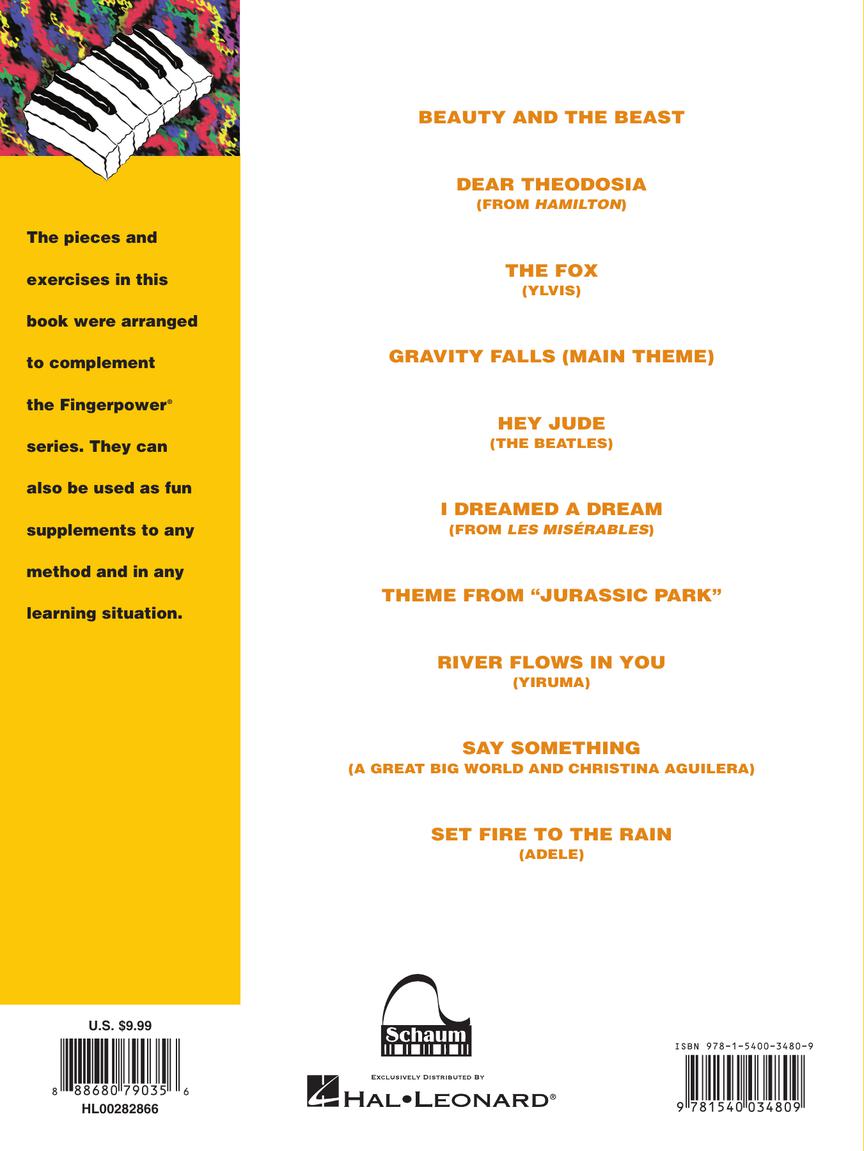 10 great pop piano solo arrangements, each with at least one fun technical warm-up! They complement the famous Fingerpower series but are also useful as motivating supplements to any method and in any learning situation. Titles: Beauty and the Beast • Dear Theodosia (Hamilton) • The Fox (Ylvis) • Gravity Falls (Main Theme) • Hey Jude (The Beatless) • I Dreamed a Dream (Les Miserables) • Theme from Jurassic Park • River Flows in You (Yiruma) • Say Something (A Great Big World and Christina Aguilera) • Set Fire to Rain (Adele).
