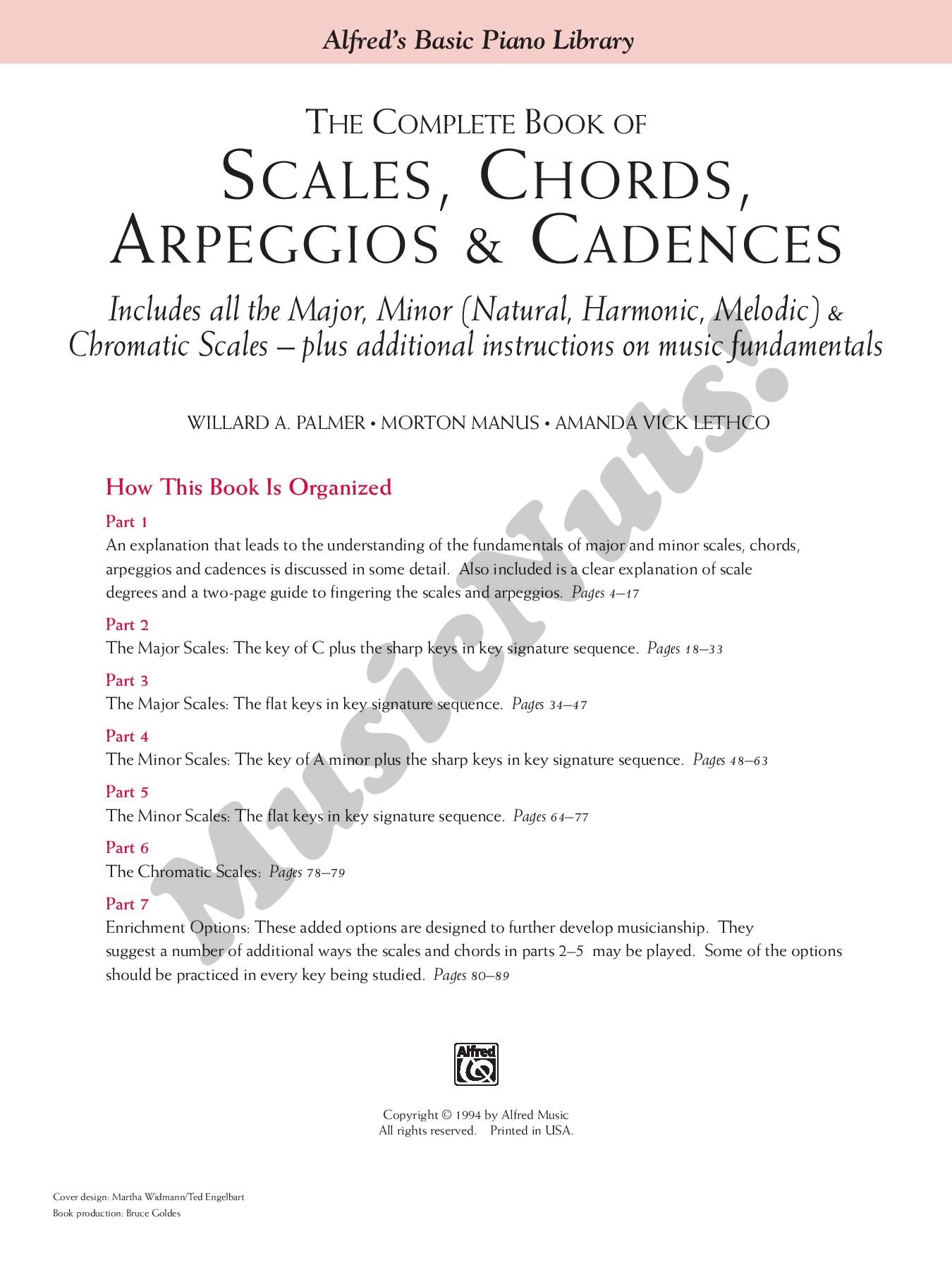 Scale, chord, arpeggio and cadence studies in all major and minor keys presented in a convenient two-page format. Includes an in-depth 12 page explanation that leads to complete understanding of the fundamentals of major and minor scales, chords, arpeggios and cadences plus a clear explanation of scale degrees and a two-page guide to fingering the scales and arpeggios. In addition, several “enrichment options” are provided with exercises such as harmonizing scales, accelerating scales expanding scales and much more! These excellent all-inclusive books teach scales, chords, arpeggios, and cadences at three different levels. The FIRST book accommodates the learning pace of younger students such as those in Alfred’s Basic, Level 2. The BASIC book is slightly more in-depth, presenting scales, chords, arpeggios, and cadence studies in all the major and minor keys. The COMPLETE book features everything in the BASIC book, plus extra features like a 12-page explanation that leads to complete understanding of the fundamentals of major and minor scales, chords, arpeggios, and cadences; a clear explanation of scale degrees; and a two-page guide to fingering the scales and arpeggios.
