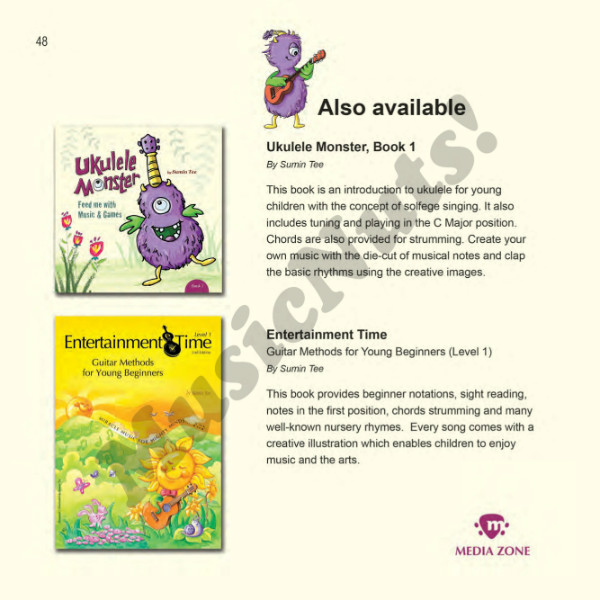 Ukulele Monster is the best instrumental friend for children. In book 2, children can start to enjoy more interesting songs after learning basic notations. All songs are indicated with chords, it would be wonderful to strum and sing along! Children’s imagination is aroused when learning the musical terms creatively, which also enhances their memory.